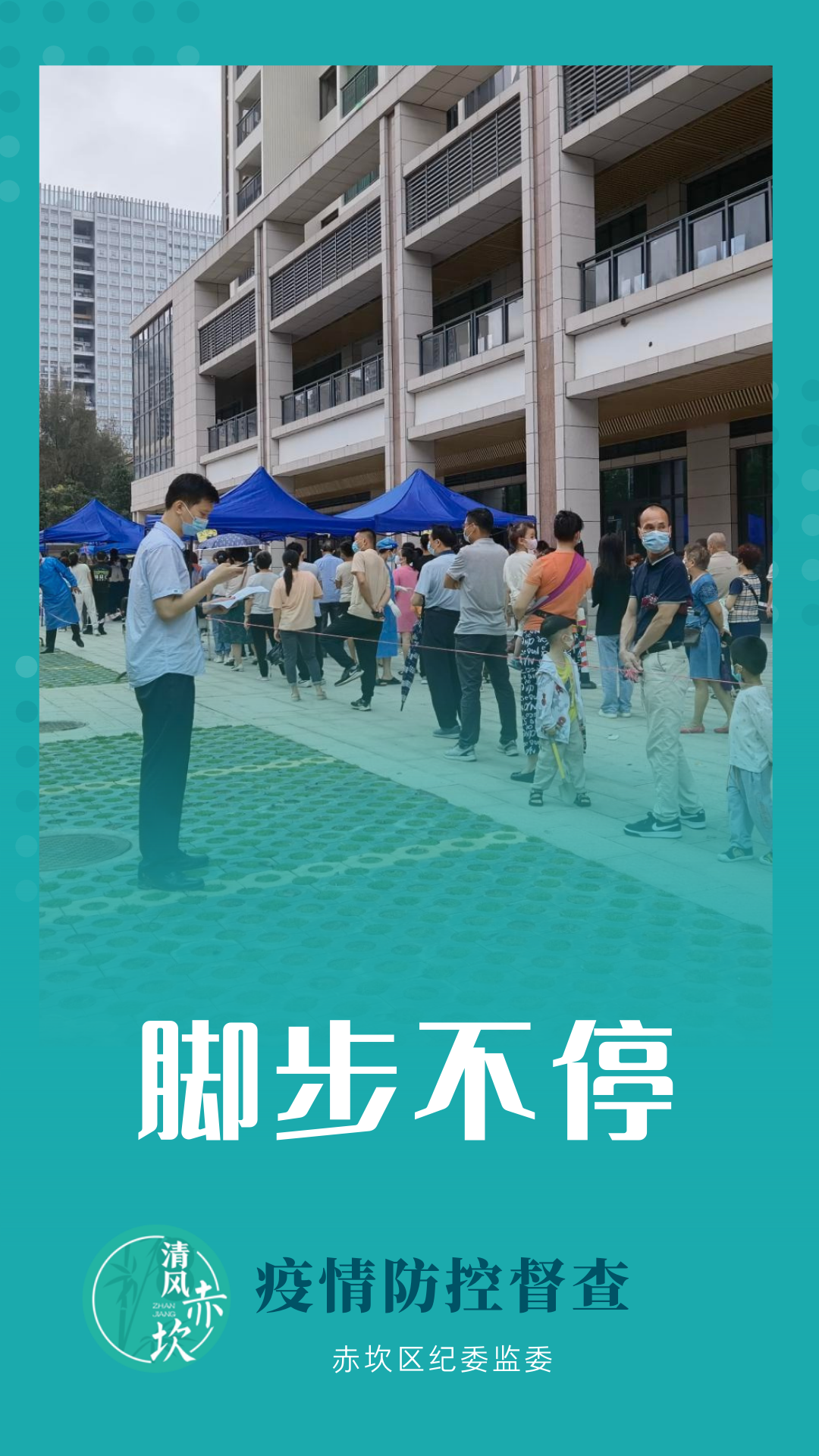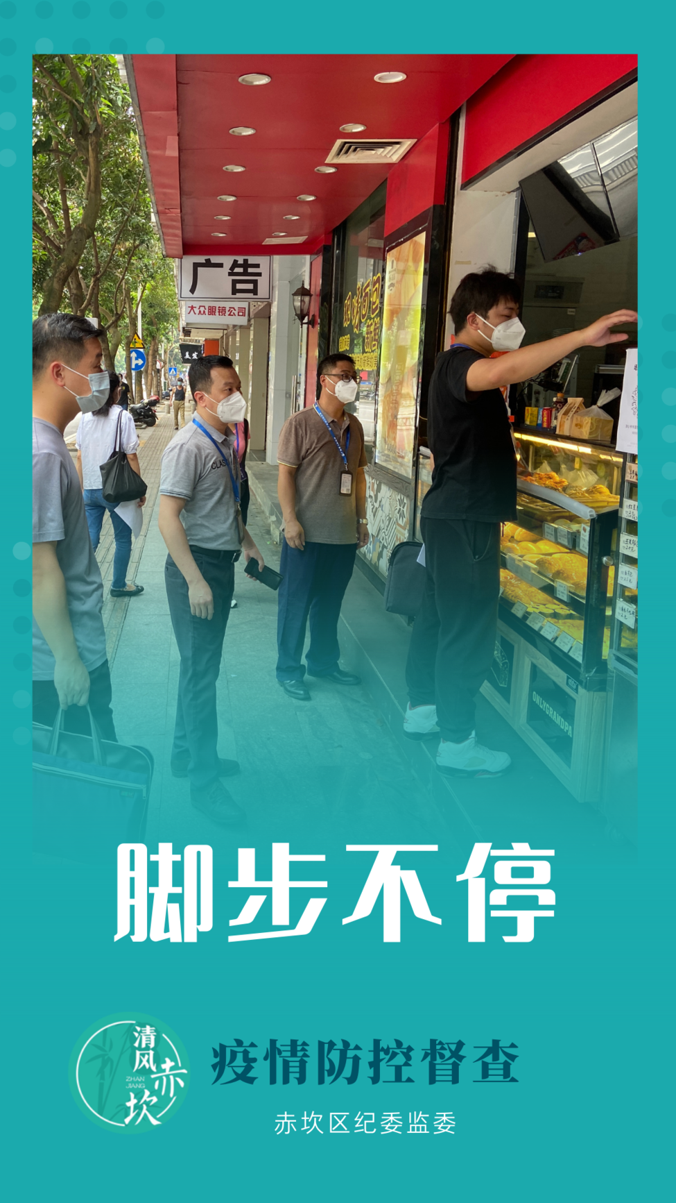 今日凌晨,新冠肺炎阳性病例在赤坎活动轨迹情况的通报,牵动着每个赤坎人的心。 赤坎区纪委监委坚持靠前监督、联合监督、靶向监督,进一步压紧压实疫情防控督查责任,坚决当好防疫卫士,我们在路上。 在核酸检测采样点,在各街道各商铺,在各重点场所和部门,到处可见纪检干部的身影。从白天到黑夜,疫情防控督查的脚步未曾停歇,他们穿梭在城市各个角落,每日步数达上万步。 个别场所未设置场所码、个别商铺未按规定暂停营业、个别采样点秩序混乱、个别场所出入口监测措施不到位……发现问题,督促整改。