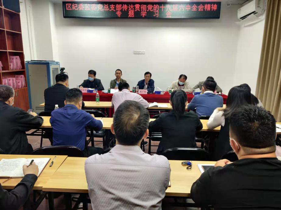 11月24日下午,党总支部组织召开党的十九届六中全会精神专题学习会,区纪委监委主要领导戴广锐以普通党员身份参加会议。会上,党总支部书记姚学沼传达党的十九届六中全会精神,部分党员交流心得体会。戴广锐指出,纪检监察干部要带头深入学习十九届六中全会精神,自觉用全会精神统一思想、凝聚共识、坚定信心、增强斗志,把学习成果转化为推动我区纪检监察工作高质量发展的实际行动。戴广锐强调,要聚焦习近平总书记重要讲话和《决议》的精神实质,以更高站位学深悟透全会精神;要聚焦党百年奋斗的伟大成就、伟大意义、伟大经验、伟大使命,以更强自觉确保全会精神落到实处;要聚焦新时代赶考之路对纪检监察工作的新要求,以更高标准推动全面从严治党向纵深发展。