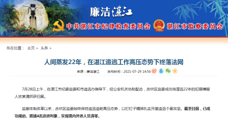 7月,在湛江市纪委监委和市追逃办指导下,经公安机关协助配合,赤坎区监委成功将潜逃22年的犯罪嫌疑人林某清抓获归案,实现境内外逃人员清零。该案中,赤坎区纪委监委成功挽回经济损失90万元,中国银行湛江分行送来感谢信。