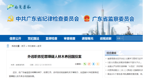 12月,在广东省追逃办统筹协调下,经湛江市、赤坎区纪检监察机关不懈努力,出逃国外3年的职务犯罪嫌疑人林木养主动回国投案。