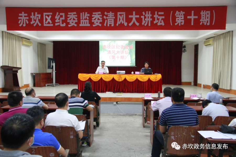 5月28日,赤坎区纪委监委清风大讲坛第十期如期开讲,邀请湛江市纪委监委第十审查调查室主任苏云峰以《拍摄警示教育片素材和召开支部会的一点体会》为题进行授课。区委常委、区纪委书记、监委代主任吴志勇出席并主持。全区纪检监察系统干部共70人参加了培训学习。