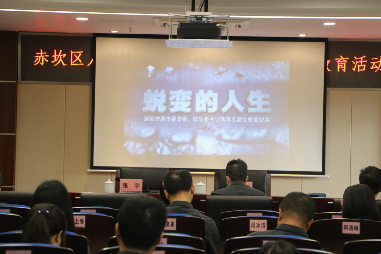 现场观看警示教育片《蜕变的人生》,剖析深圳市原市委常委、政法委书记蒋尊玉违法违纪案件的特点、成因及违法违纪者的思想堕落轨迹,从中汲取深刻教训,进一步加强公正廉洁司法和法院队伍从严管理监督的政治责任感,警示干警知敬畏、存戒惧、守底线,始终做到警钟长鸣。