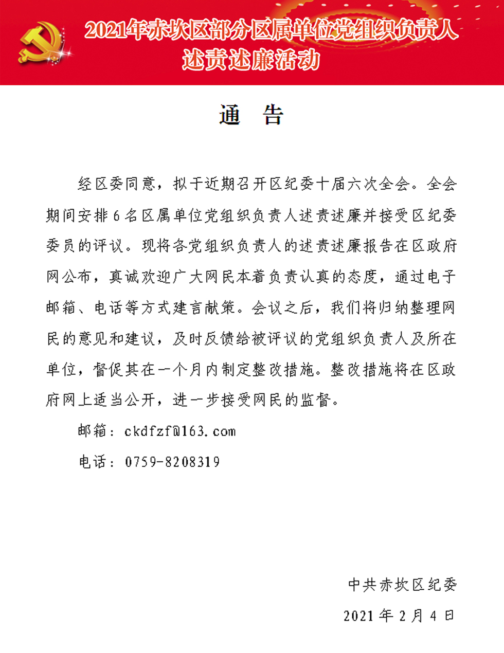 2021年赤坎区部分区属单位党组织负责人述责述廉活动通告