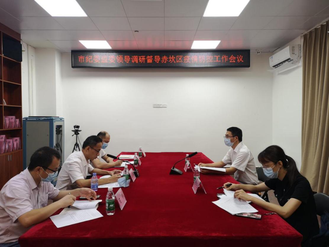实地调研督导结束后,蔡齐旺同志一行返回区委会议室召开工作会议。会上,谢春晖同志简要汇报赤坎区纪委监委开展疫情防控监督检查工作情况,与会人员针对目前的疫情防控部署要求展开座谈交流。蔡齐旺同志对赤坎区疫情防控工作给予充分肯定,强调要紧绷疫情防控安全弦,坚持不懈把疫情防控工作抓细抓实。要提高思想认识,保持高度警惕性;要严格按照上级部署的任务表,切实将各项疫情防控要求落实到位;要进一步加强督导检查,强化对重点场所、重点人群的精准监督、全程监督,发现违纪违法问题,要依规依纪依法严肃问责。