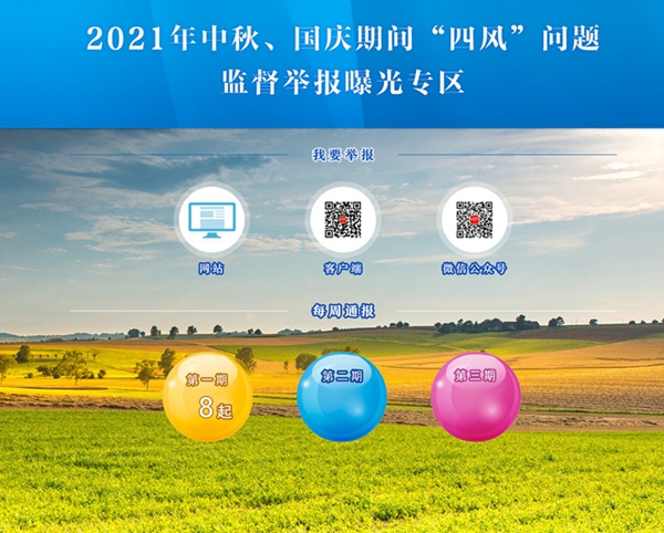 为锲而不舍落实中央八项规定及其实施细则精神,中央纪委国家监委网站推出“中秋、国庆期间‘四风’问题监督举报曝光专区”,畅通监督渠道,加大典型案例通报曝光力度,增强警示震慑和教育引导作用。专区开设“我要举报”窗口,链接中央纪委国家监委统一举报平台,欢迎网友通过网站、手机客户端和微信公众号对节日期间违规吃喝送礼等问题进行举报。专区“每周通报”栏目从9月22日起,分3次集中对各地查处的“四风”典型问题点名道姓通报曝光,以风清气正的节日氛围助力构建清正廉洁的政治生态。